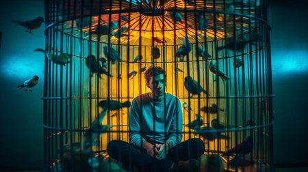 This captivating image features a delicate birdcage against a soft bokeh background in vibrant turquoise and gold hues. The aesthetic evokes themes of freedom and restraint.