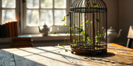 A decorative birdcage sits on a rustic wooden table, housing a thriving ivy plant. Sunlight streams through the window, casting shadows on the surface alongside vintage teapots.