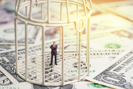 American first, financial war under protection, miniature businessman president inside birdcage on pile of US dollar banknotes, metaphor of limited thinking, money trap or anti globalization.