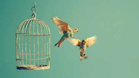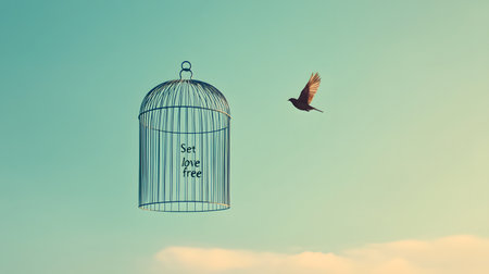 A solitary bird soars freely against a vast, serene sky, having escaped an empty, open birdcage. The scene evokes a profound sense of liberation, new beginnings, and the triumph of the spirit over confinement.