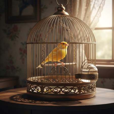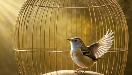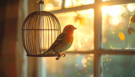 In the soft, golden light of a new day, a robin perches on the outside of its cage, looking out the window. This moment captures a powerful symbol of freedom, choice, and the hope of new beginnings, leaving confinement behind for the bright possibilities ahead.