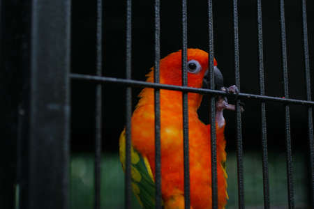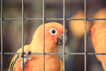 Vintage tone of Yellow and orange parrot in a cage at public park