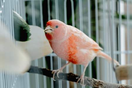 Top view of a caged parakeet resting in its habitat, highlighting bird care and domestic pet environments