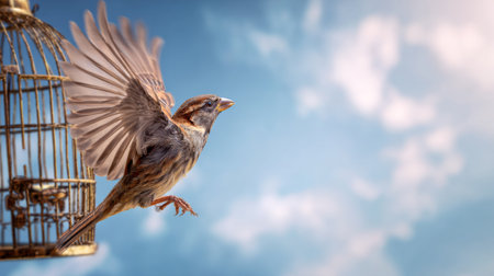 Sparrow escapes from an open cage soaring into the blue sky filled with fluffy clouds and freedom