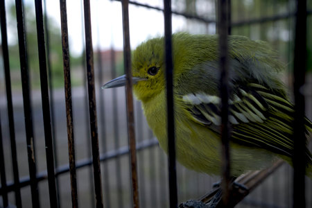 Captured in a confined space, a feathered dove peers through the rusty bars of its cage, its melancholic gaze hinting at a longing for freedom and wide-open spaces in its life.