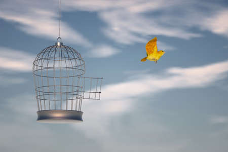 Canary flying off a bird cage to the sky. Escape and freedom concept. This is a 3d render illustration