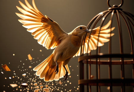 A white dove takes flight from a broken birdcage, symbolizing freedom and liberation.