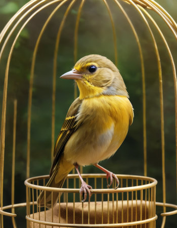 A bright yellow bird singing joyfully from its cage, illuminated by warm light. The soft bokeh effect in the background adds a peaceful ambiance to this delightful scene.