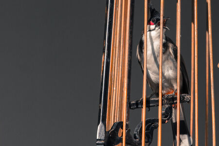 Bird in a cage. Vintage style. Selective focus. Toned.