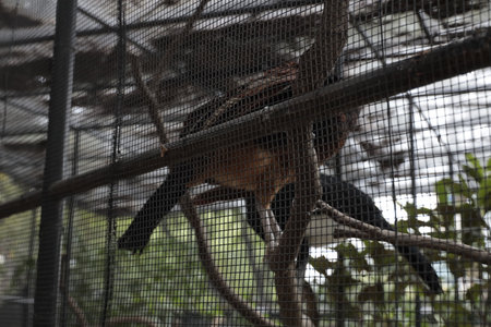 Two birds with distinct plumage perch on branches inside a metal mesh enclosure, surrounded by green foliage.