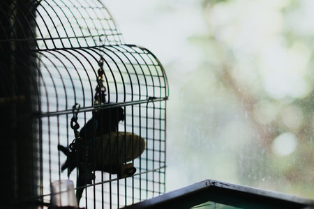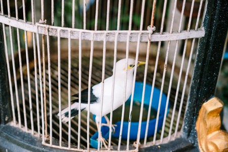 Captured in a confined space, a feathered dove peers through the rusty bars of its cage, its melancholic gaze hinting at a longing for freedom and wide-open spaces in its life.