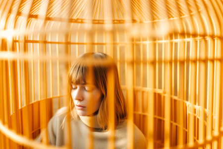 A caged bird with drooping wings, symbolizing the loss of freedom and hope in the face of an unfair circumstance.