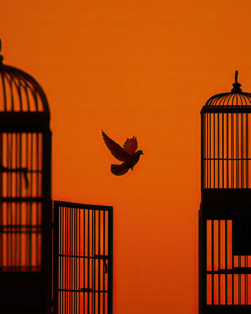 A bird takes flight near a cage, silhouetted against a vibrant orange and yellow sky. The image displays dramatic lighting, highlighting the bird's wings. This conceptual image can be used for various design projects, including themes of freedom and liberation, and editorial content.