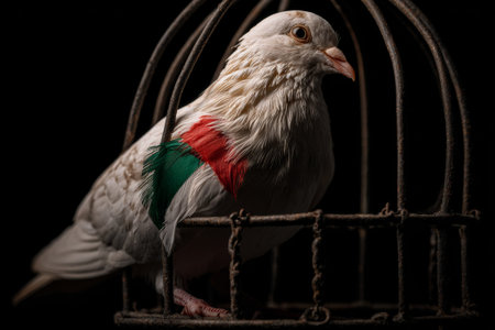 White dove with palestinian flag colored feathers, confined in a rusty cage, symbolizing the struggle for peace in palestine
