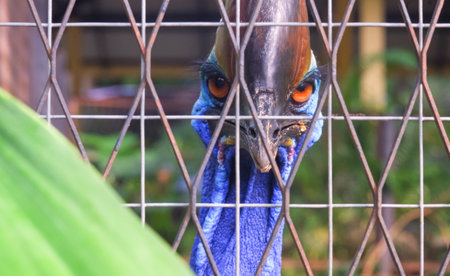 Close up of Southern Cassowary face is looking at camera while inside of enclosure at the zoo, animal wildlife portrait