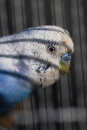Close-up of a beautiful blue parakeet perched on a white cage bar, showcasing its intricate feather patterns and subtle grace in a serene indoor setting.