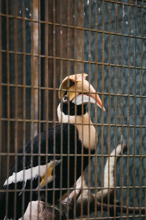 A closeup vertical portrait of a great hornbill bird behind cage bars in a zoo