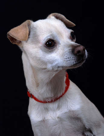 Portrait of a mixed breed dog wearing a red collar. On black background.