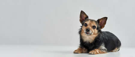 Portrait of a mixed breed dog on a gray background. Studio shot.