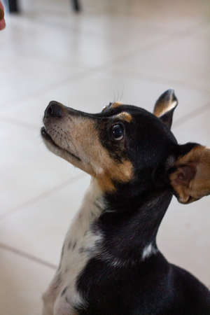chihuahua dog trying to catch a treat or cookie in the air , with funny face expression, isolated on black background