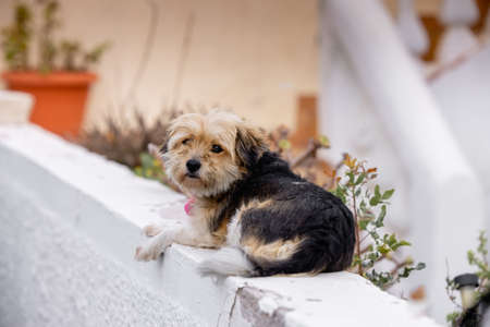 Pretty old dog resting on the street. Oia village, Santorini island, Greece