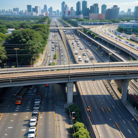 A top-view perspective of an elevated highway interchange, showing its modern design and infrastructure. Generative AI