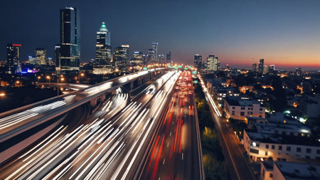 A stunning nighttime view of a bustling highway with vibrant light trails from moving vehicles, framed by a modern city skyline, showcasing urban life and energy.