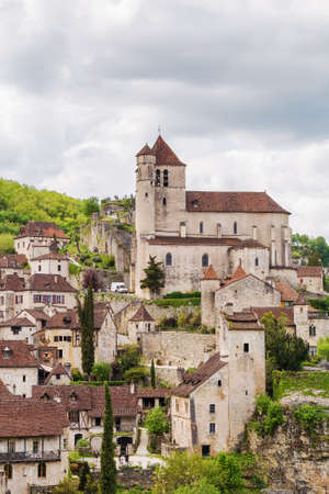 View of Saint-Cirq-Lapopie village with catholic church, France