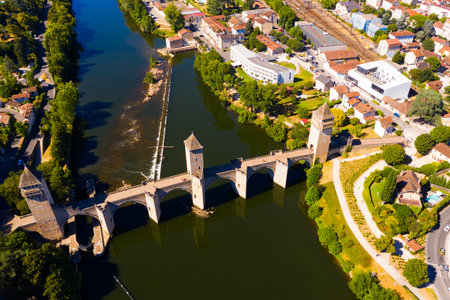 Drone view of bridge Pont Valentre crossing Lot River in Cahors