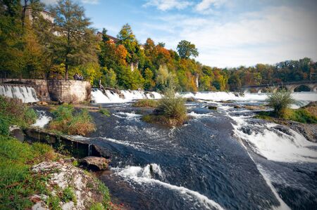 Mighty white rapids of the Rhine River at the Rhine Falls, the famous and biggest waterfall in Europe located in Schaffhausen, Switzerland