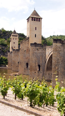 Pont Valentre, a 14th-century six-span fortified stone arch bridge crossing the Lot River to the west of Cahors in Lot, Midi-Pyrenees, France.