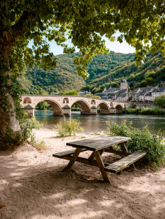 A tranquil summer scene featuring a rustic wooden table shaded by leafy branches, offering a picturesque view of an ancient stone arch bridge and a quaint village su