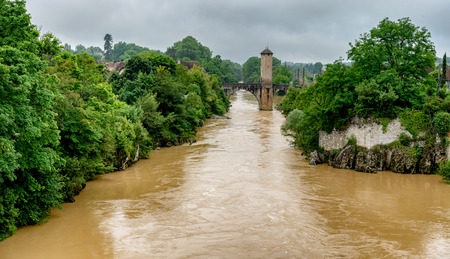 River L'Adour in the city of Orthez, with a bridge with a tower in the center