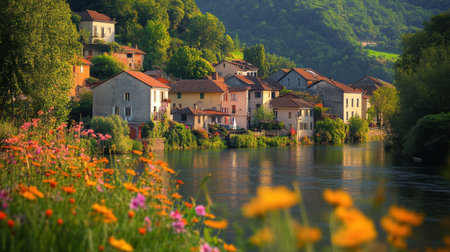 A tranquil morning casts a soft golden light over a riverside village, where colorful wildflowers bloom along the banks and quaint houses sit peacefully beside the water.