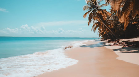 Soft waves lap at the golden sand, while palm trees cast gentle shadows in a serene tropical setting during a bright sunny day. The turquoise water invites relaxation.