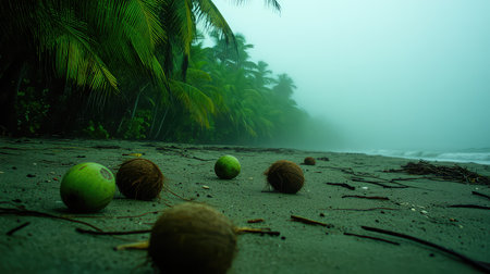 A tranquil beach scene featuring coconut shells scattered along the shoreline, with lush palm trees shrouded in fog, creating a serene tropical atmosphere.
