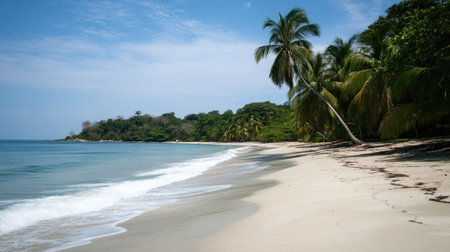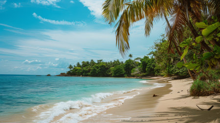 A picturesque tropical beach featuring swaying palm trees and gentle ocean waves. The scene captures the beauty of nature, perfect for relaxation and escape.