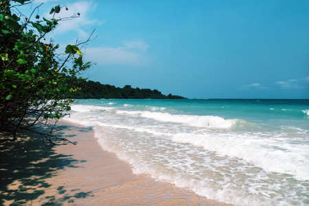 Vintage photo of beautiful beach landscape with cloudy sky and sea with waves. Andaman and Nicobar Islands. India. Indian ocean. retro toning