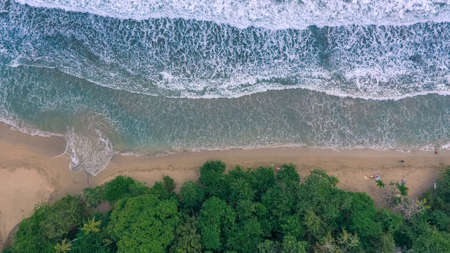 travel and vacation background - aerial view of tropical beach with ocean waves and palm trees