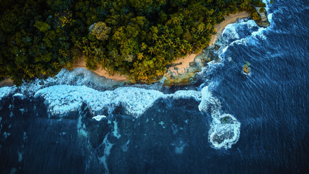 High angle shot of a pristine tropical beach, featuring foamy ocean waves rolling onto golden sand, bordered by lush green palm trees under bright sunlight.
