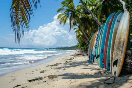 Exciting tropical beach surfing adventure with palm trees, sunny day, ocean waves, surfers, and summer outdoor water sports activity