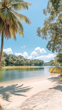 A tranquil beach features swaying palm trees beside a calm body of water. Bright blue skies and fluffy clouds create a perfect backdrop for relaxation in this natural oasis.