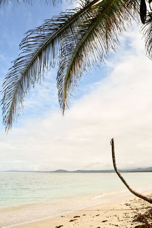 Beautiful shot of a wild nature of exotic island with green palms and sand surrounded by transparent turquoise ocean water
