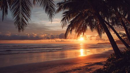 Tranquil tropical sunrise with palm trees and silhouettes on the beach. Creating a serene morning beauty overlooking the ocean and calm horizon