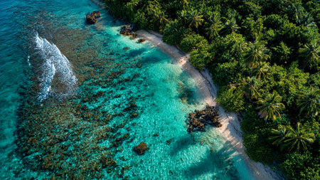 Aerial view of beautiful tropical beach with turquoise water and coral reef