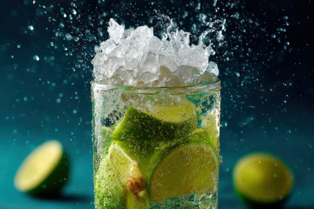 Mojito cocktail with lime, ice and splash on blue background