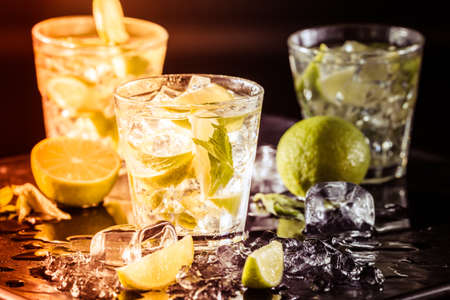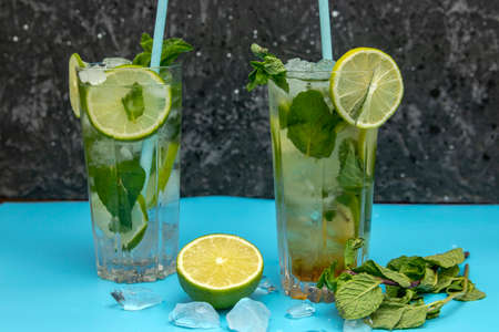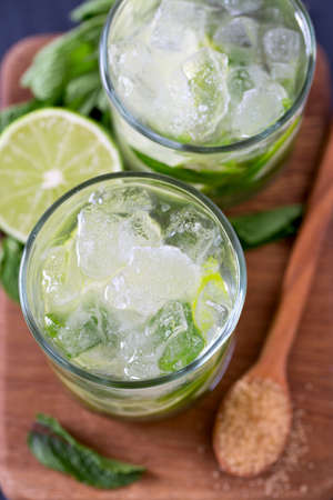 Mojito cocktail with lime, mint and ice in glasses.