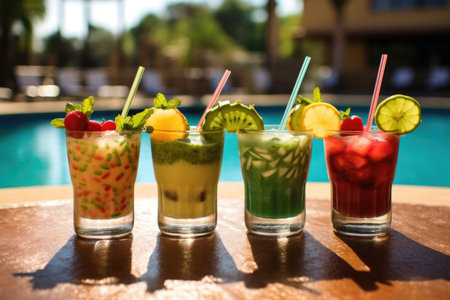 caipirinha cocktails lined up on poolside table, created with generative ai
