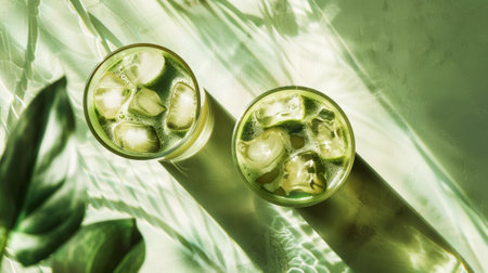 Top view of an iced matcha latte on a pastel green background with ice cubes. Refreshing cold drink. Generative AI.