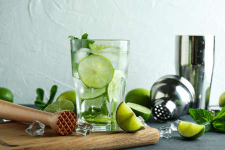 Summer alcoholic cocktail mojito or gin tonic with rum, mint, lime and ice, bar tools on concrete gray blue background. Mojito cocktail with splash and drops